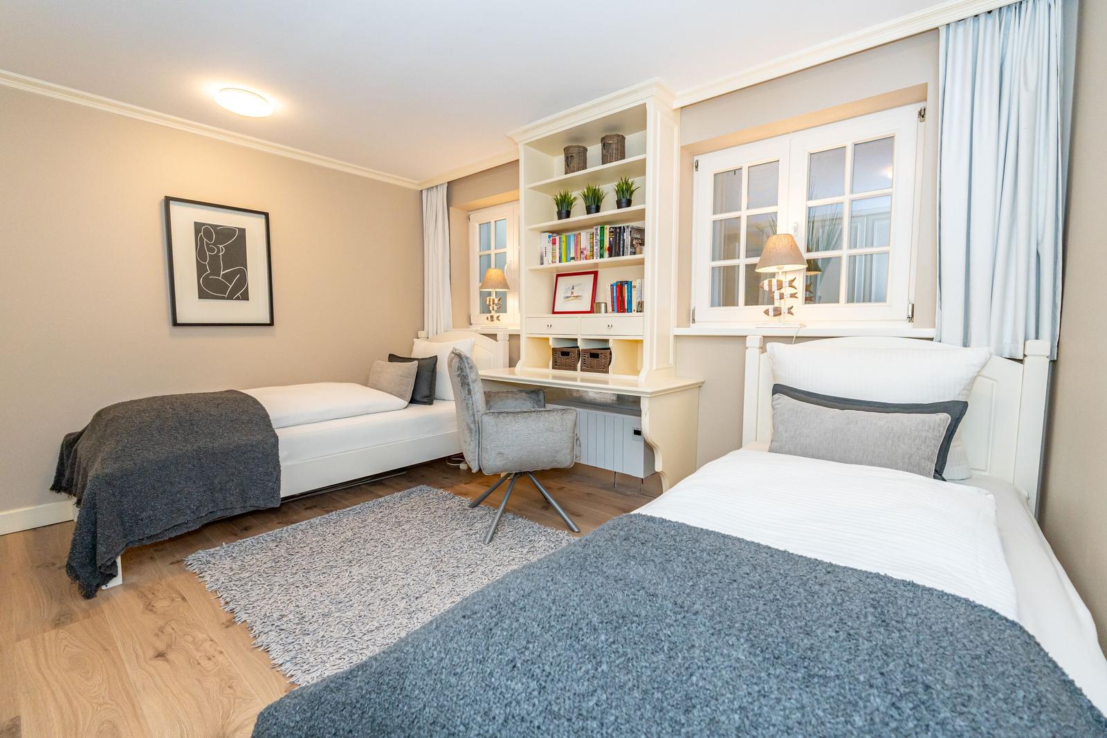 Über die Wendeltreppe gelangt man ebenfalls ins Untergeschoss. Hier befindet sich ein weiteres gemütliches Schlafzimmer mit zwei Einzelbetten und einem Schreibtisch. Im angrenzenden Badezimmer ist, zusätzlich zur selben modernen Ausstattung des Obergeschosses, eine Waschmaschine vorhanden.