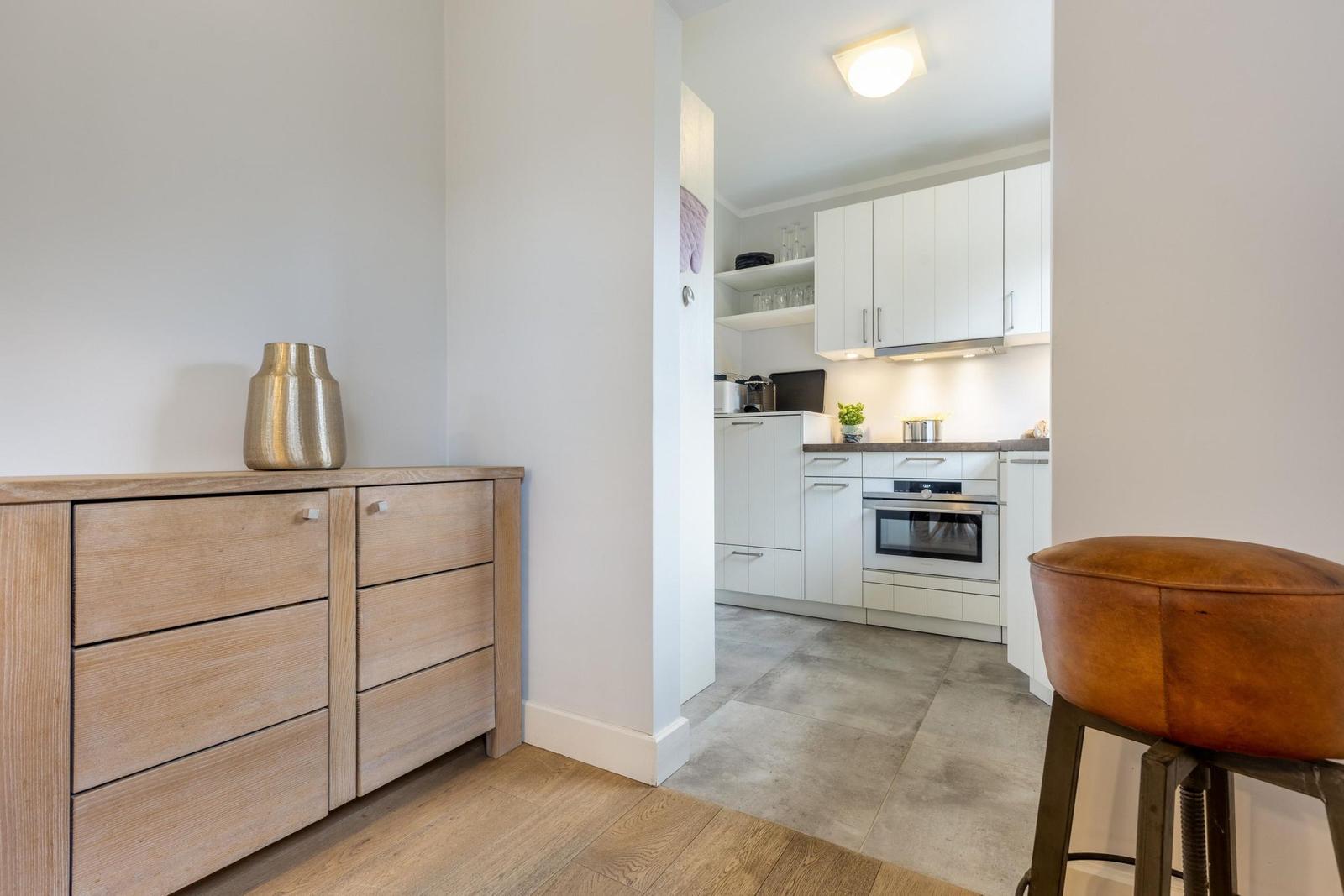 Die offene Küche ist mit einem Elektro-/Gasherd, Backofen, Geschirrspüler und Kühlschrank ausgestattet und bietet ausreichend Platz für gemeinsame Kochmomente. Eine Kaffeemaschine und Geschirr sowie Besteck runden die Ausstattung ab. Der gemütliche Esstisch lädt zum Verweilen ein, während das helle Wohnzimmer mit Sofa und Sessel für Entspannung sorgt.