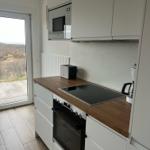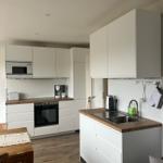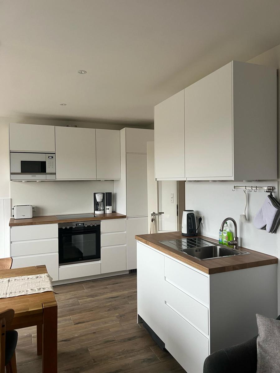 Wohn- und Esszimmer: neue Küchenzeile seit Januar 2023 (Backofen, Induktionsherd 4 Platten, Kühlschrank, Kaffeemaschine, Wasserkocher, Toaster), Esstisch für 4 Personen, Wohnbereich mit Couch, Smart-TV, Wohnzimmertisch