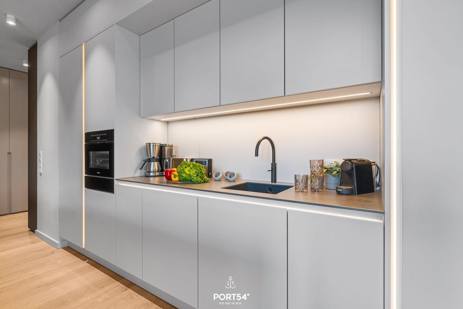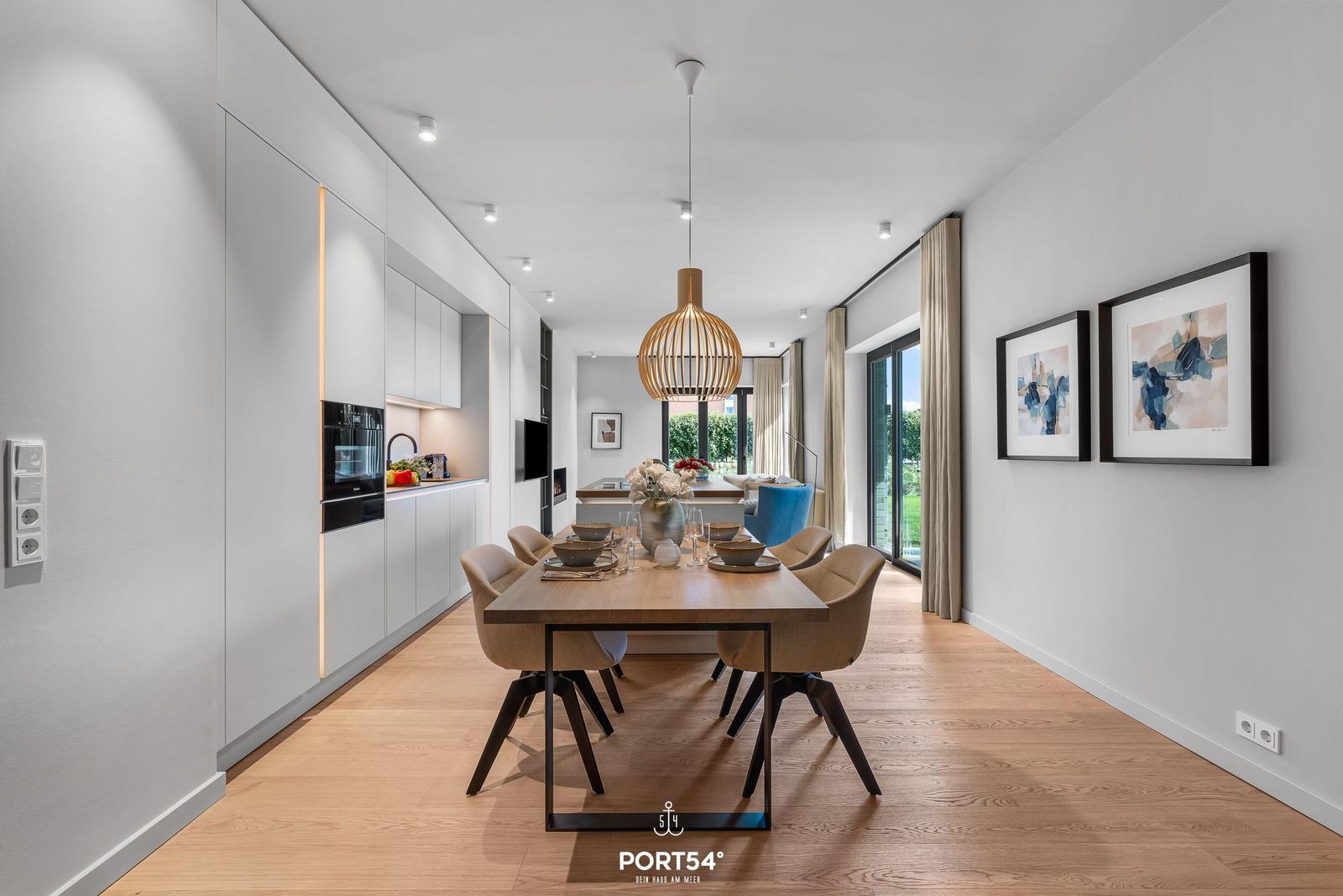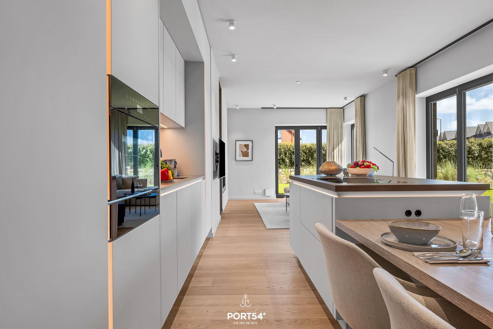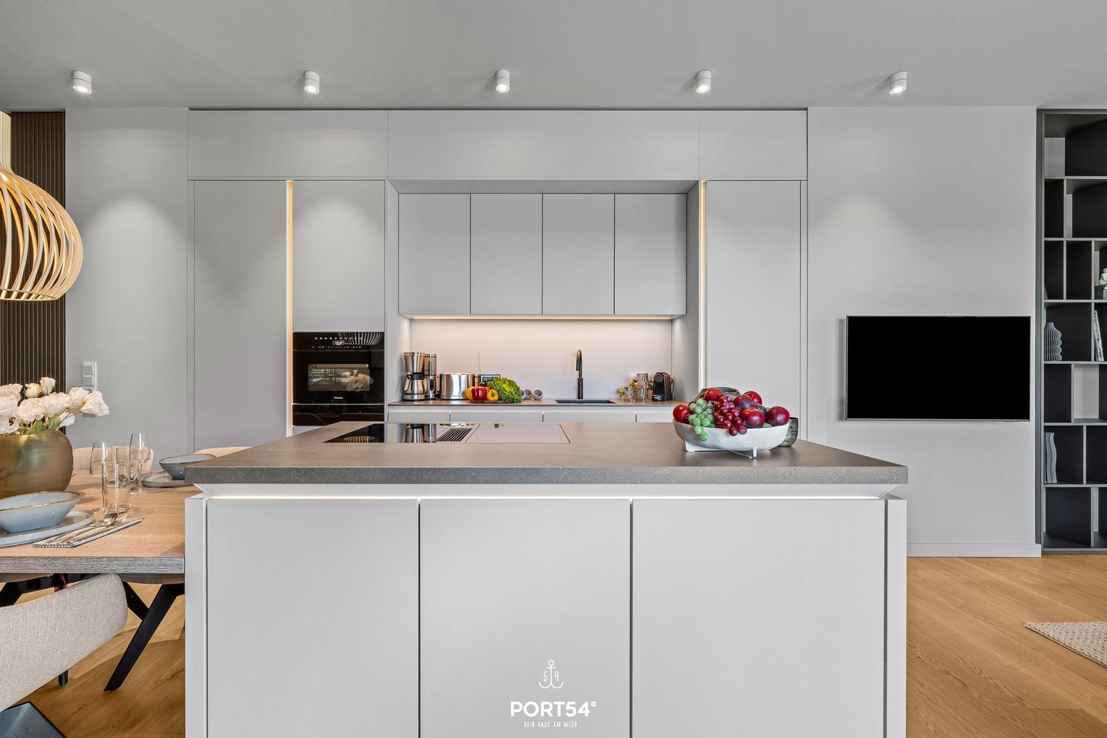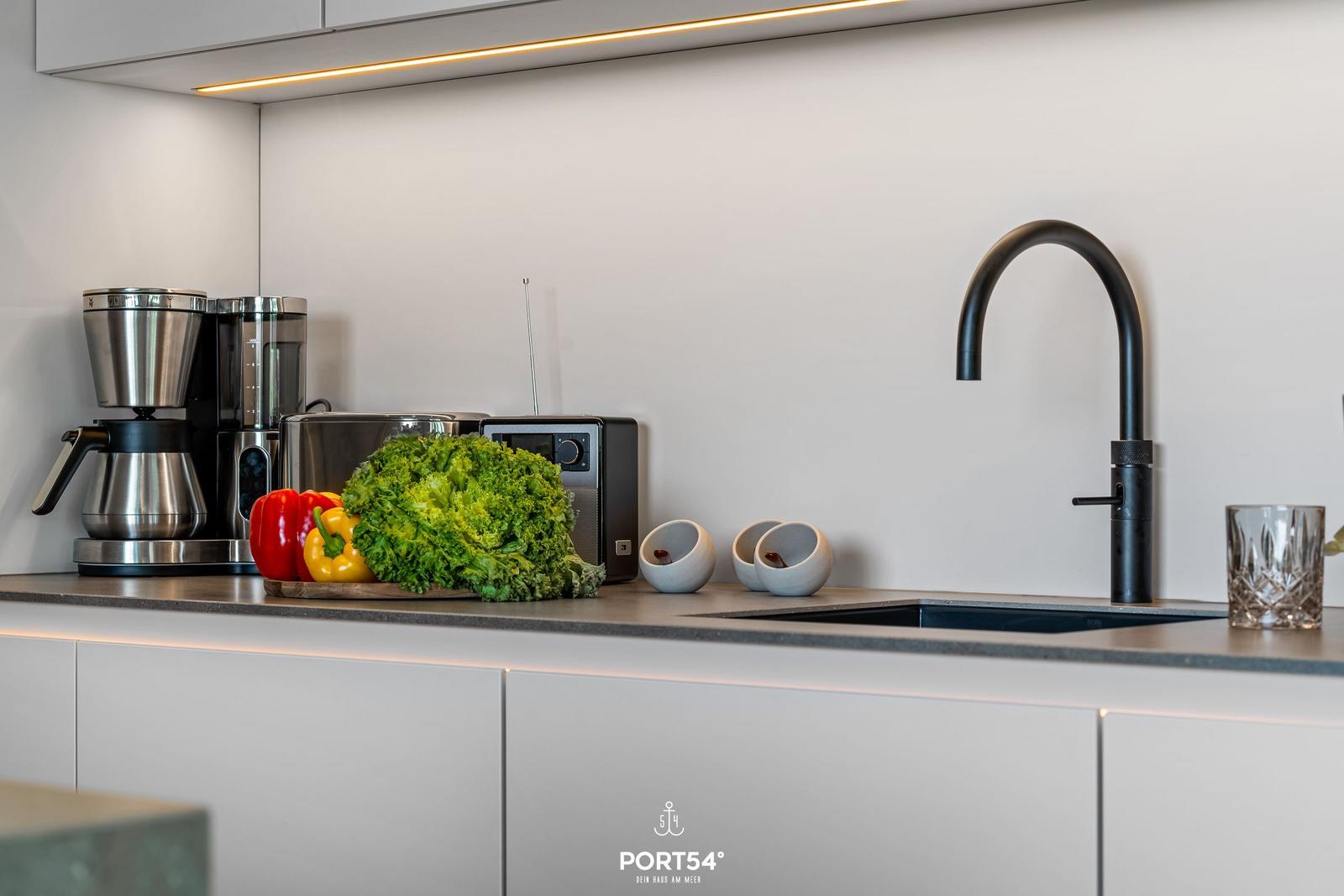 Ein offener Wohnbereich mit großzügiger Sofaecke, Ethanol Kamin und Esstisch lädt zum Verweilen ein und bietet einen perfekten Ort für gesellige Abende. Die voll ausgestattete offene Küche von SieMatic punktet mit modernen Geräten wie einem Induktionsherd, Backofen, Kühlschrank, Spülmaschine und einem Weinkühlschrank. Hier können Sie kreative Gerichte zubereiten oder einfach das Frühstück auf der Terrasse genießen, während Sie die frische Meeresbrise einatmen. Außerdem finden Sie in der Küche einen Quooker, damit lässt sich problemlos heißes Wasser, sowie Sprudelwasser erzeugen.