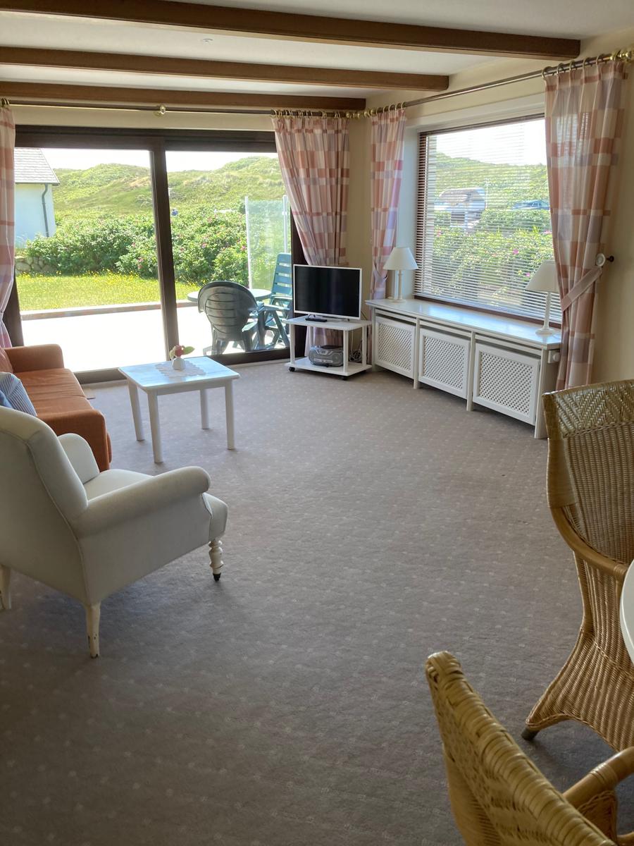 Wunderschön ist der Blick vom Wohnzimmer aus - hier schaut die Sylter Dünenlandschaft direkt ins Wohnzimmer hinein.