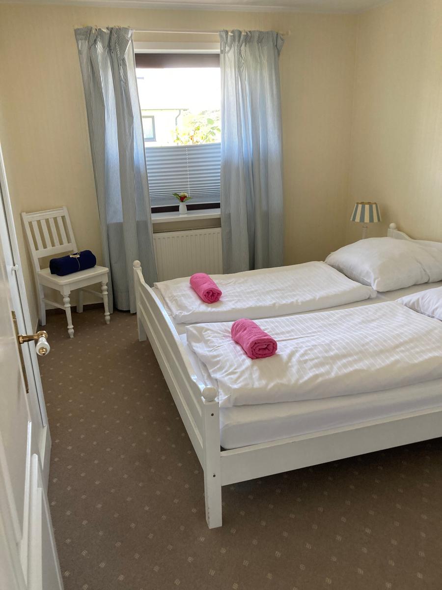 Die ca. 78 qm große Wohnung erstreckt sich über die gesamte Hausfront und hat zwei getrennte Schlafzimmer mit jeweils einem Doppelbett, eine vollausgestattete, separate Küche mit Geschirrspüler und ein großes Wohnzimmer mit einer ausziehbaren Schlafcouch. Vom Wohnzimmer aus ist die eigene Terrasse mit Strandkorb begehbar.