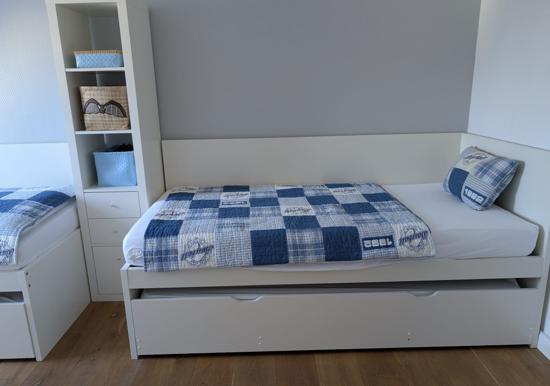 In der Dachgeschoss-Ebene befinden sich 2 Schlafzimmer, eines davon mit Doppel- und das andere mit zwei Einzelbetten. Beide Schlafzimmer verfügen ebenfalls über Flatscreen-TV.