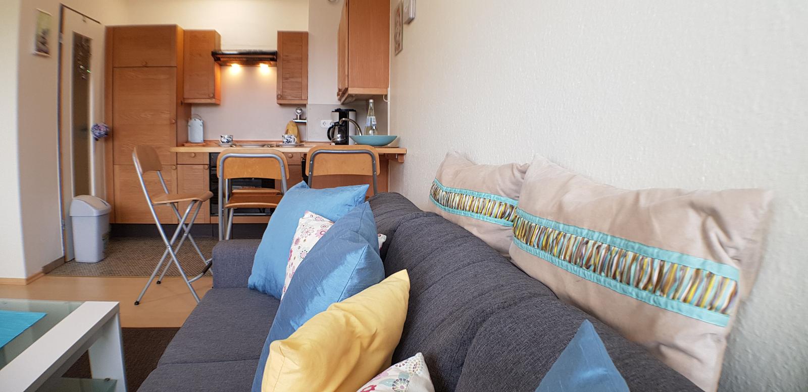3 Sterne ***Liebevoll eingerichtete 2-Zi-FeWo mit großer West-Loggia. Kombinierter Wohnraum m. Küchenzeile u. Esstresen. Schlafzimmer m. Doppelbett u. Zugang zur Loggia. Bad m. Badewanne. Fahrstuhl im Haus. Eigener PKW Stellplatz auf dem Grundstück. WLAN!