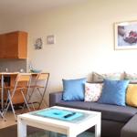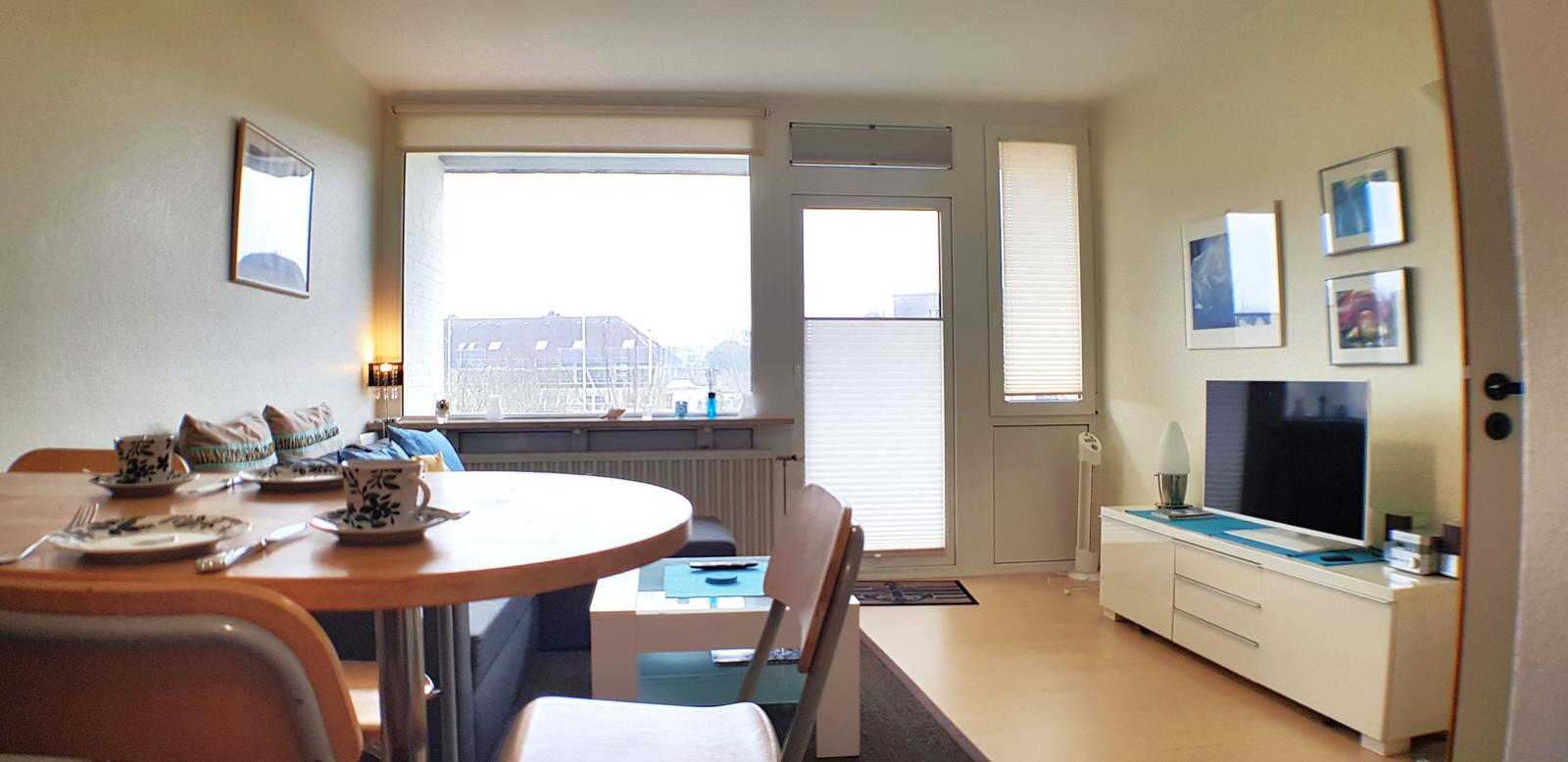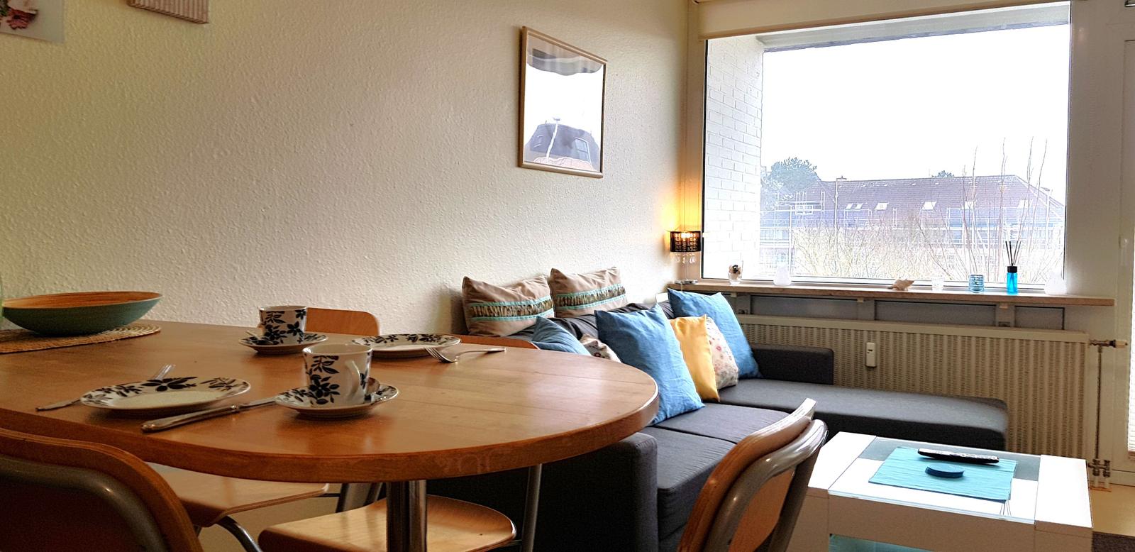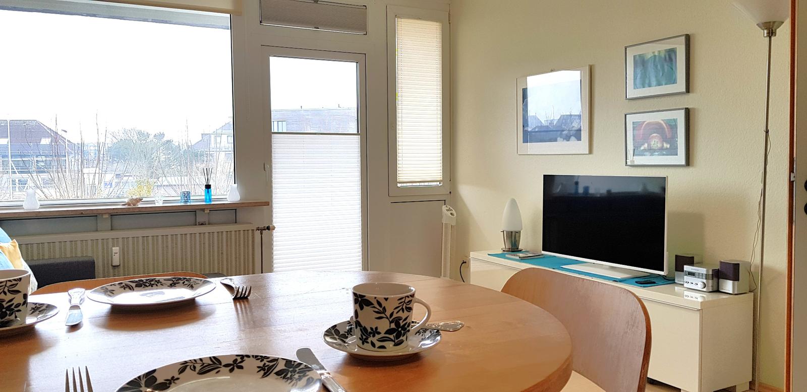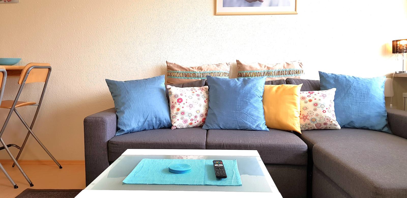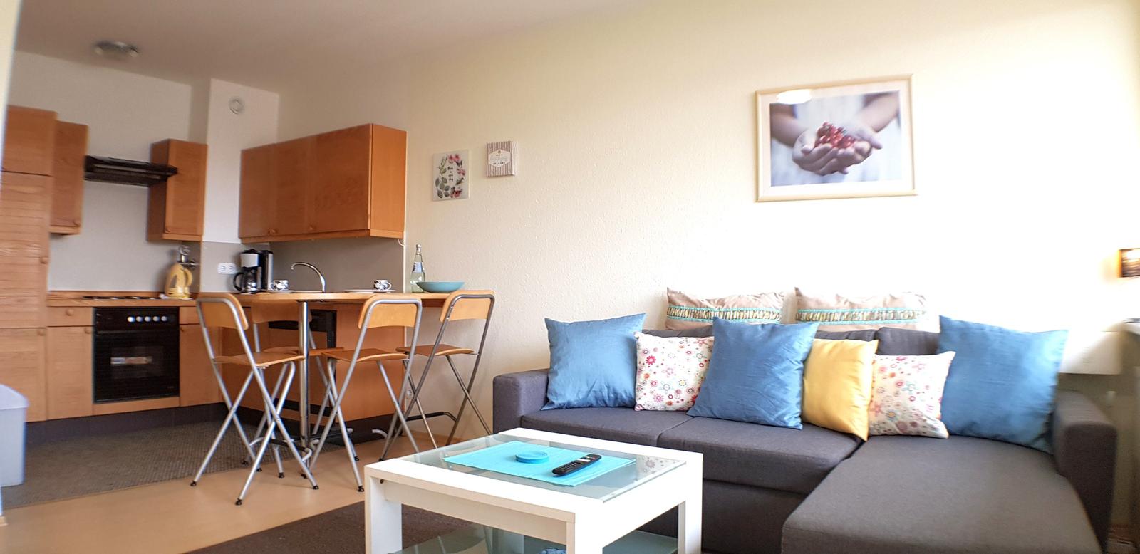 Die Ferienwohnung befindet sich im 1. Obergeschoß eines 3-stöckigen Gebäudes genau in der Mitte. Die Räume sind hell und freundlich gestaltet. Die Küche ist komplett ausgestattet. Geschirrspüler und Backofen runden das Angebot ab. Im Schlafzimmer finden sie ein komfortables Doppelbett mit verstellbaren Lattenrosten. Badezimmer mit Badewanne. Reisen Sie zu zweit und brauchen eine separate Schlafmöglichkeit, steht im Wohnraum ein Schlafsofa zur Verfügung. Kostenloses WLAN.