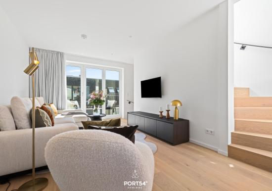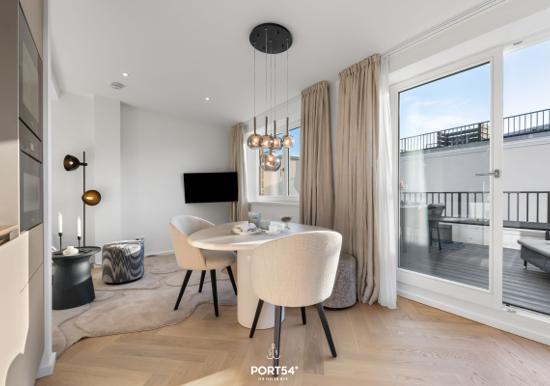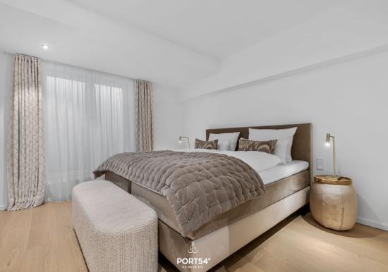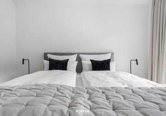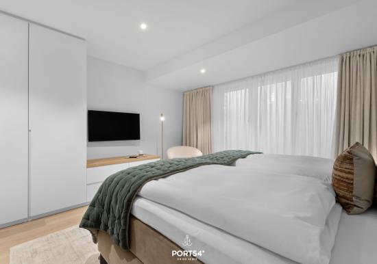 Das Luxus 2 Zimmer Apartment bietet Platz für bis zu 2 Personen im ersten und zweiten Obergeschoss. Es erwartet Sie ein offener Wohnbereich mit einem gemütlichem Sofa und großem Flachbild-TV, die voll ausgestattete Küche, sowie ein Schlafzimmer mit großem Doppelboxspringbett, mit Flachbild-TV. Außerdem das exklusive Bad mit großer Regendusche, Waschbecken, Föhn und WC.