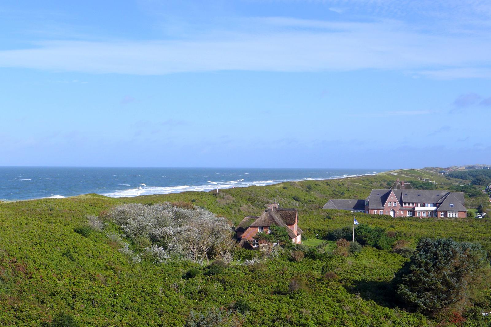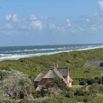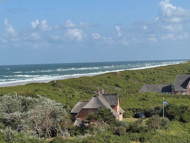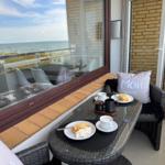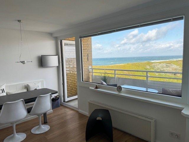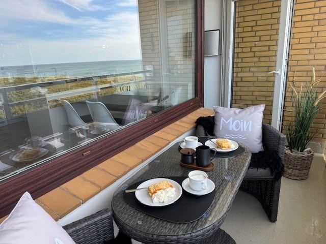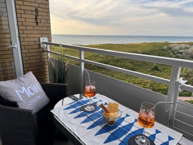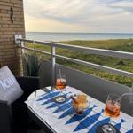 Auf dem Balkon mit Meer- und Dünenblick, ausgestattet mit einer hochwertigen Sitzgarnitur, lassen sich ein gemütliches Frühstück oder ein abendliches Glas Wein und abhängig von der Jahreszeit der Blick auf atemberaubende Sonnenuntergänge genießen.