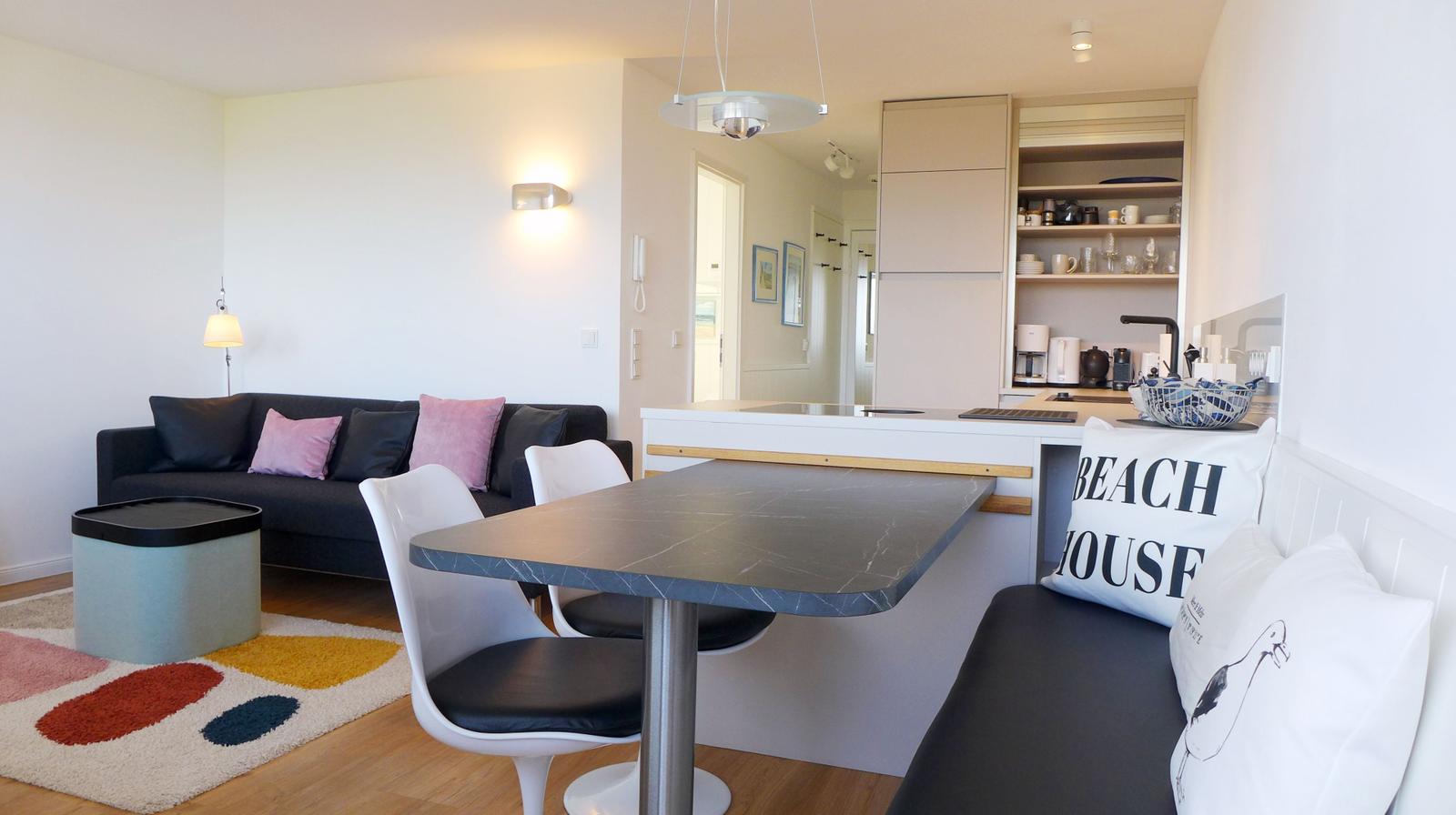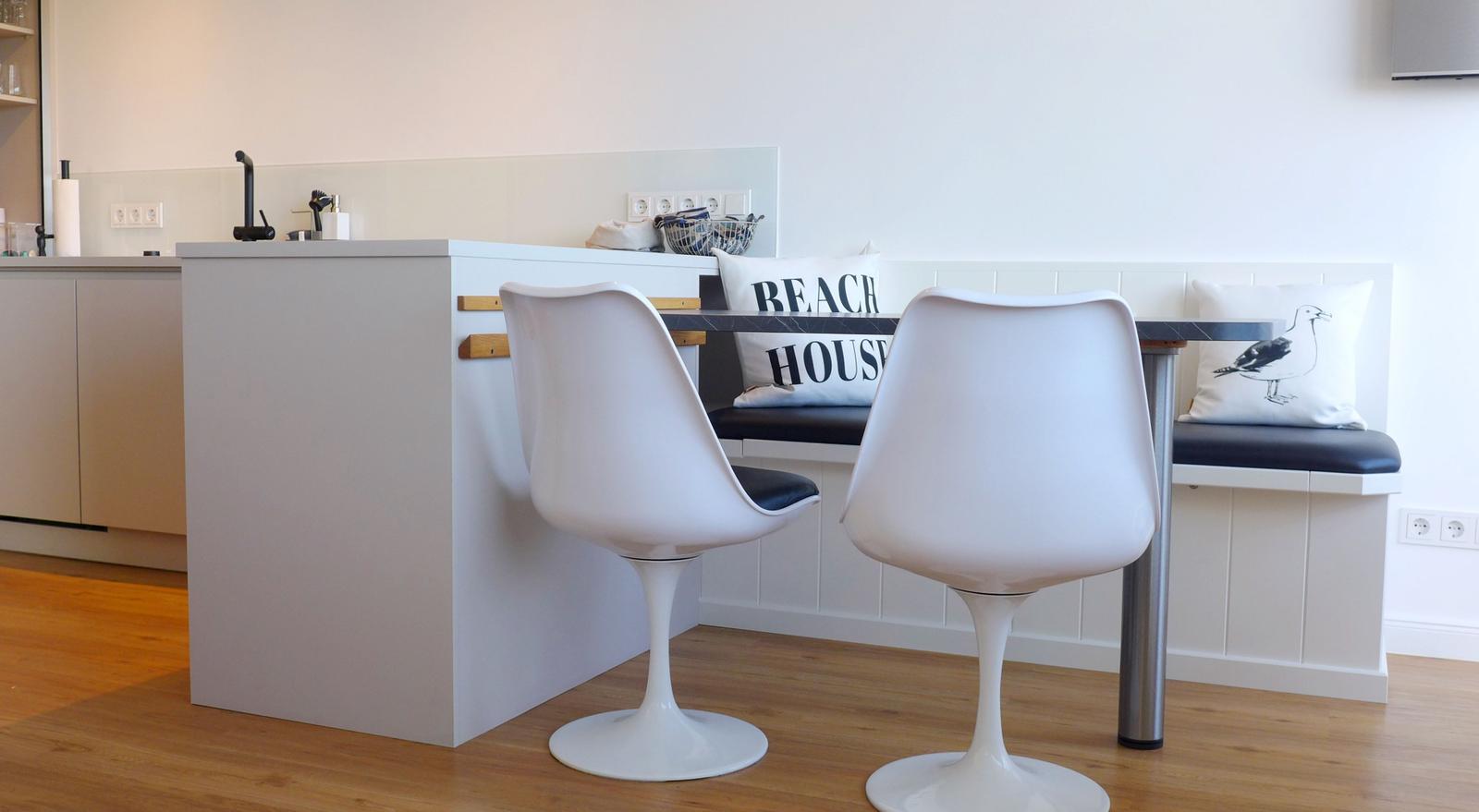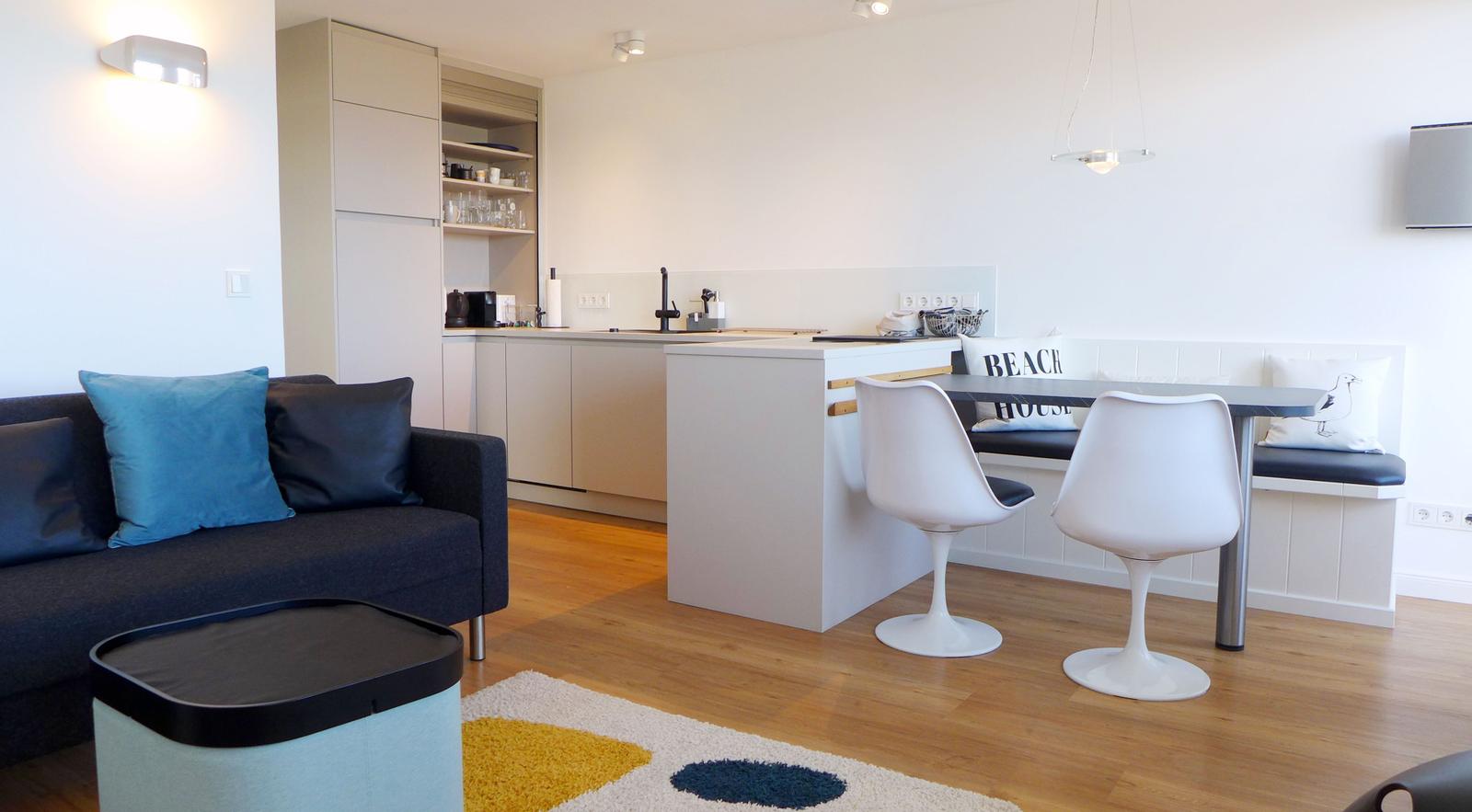 Es erwartet Sie ein außergewöhnliches Urlaubsdomizil, das den friesischen Stil mit moderner Eleganz verbindet. Das lichtdurchflutete Appartement empfängt Sie mit einem durchdachten Grundriss und ansprechendem Ambiente. Der Wohnbereich mit hochwertig ausgestatteter offener Küche (Induktionsherd, Muldenlüfter, Geschirrspülmaschine, großer Kühlschrank mit Gefrierfach, Mikrowelle mit Quarzgrill, 2 Kaffeemaschinen: Kapsel und Filter, Toaster, Eierkocher, elektrische Saftpresse etc.) weckt Lust zum Kochen und Relaxen mit Blick aufs Meer. Ein als gemütliche Koje gestaltetes separates Schlafzimmer mit Fenster nach Osten und Morgensonne ist ausgestattet mit zwei Einzelbetten, die bei Bedarf zu einem Doppelbett vereint werden können. Maßgefertigte Tischlereinbauten bieten viel Platz für Ihre Kleidung und persönliche Gegenstände. Im modern gestalteten Badezimmer finden Sie eine große Duschanlage mit niedrigem Einstieg und Regendusche, einen Handtuchheizkörper, Föhn sowie einen beleuchteten Spiegel mit Dimmfunktion. Eine Essecke mit Friesenbank und modernen Stühlen im skandinavischen Stil bietet Platz für 4 Personen und lädt ein zu gemeinsamen Mahlzeiten bei geöffneter Balkontür und Meeresrauschen. Das Wohnzimmer ist ausgestattet mit einer hochwertigen Couch (die bei Bedarf zwei zusätzliche Schlafplätze bietet) sowie einer gemütlichen Leseecke mit Schaukelstuhl. Ein Streaming-Lautsprecher, eine Stereoanlage mit Radio und CD, ein hochwertiger Smart-TV mit Kabelfernsehanschluss und WLAN mit schnellem Internet bieten Unterhaltung und die Möglichkeit zum Homeoffice. Durch ein großes Panoramafenster bietet die Wohnung vom Wohnzimmer aus eine überwältigende Sicht auf das Meer und die Dünen, und durch die Lage am Brandenburger Strand den Blick auf die Aktivitäten der Windsurfer.