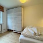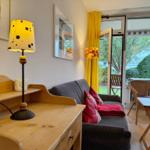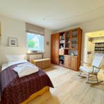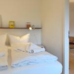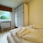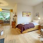 Das zur Loggia ausgerichtete Wohnzimmer ist möbliert mit einer geräumigen Essecke, einem kleinen Schreibplatz, einem Sofa und einem Zusatzbett (0,90 x 2,00). Durch das Westfenster scheint auch am Abend noch Sonne hinein. Das Schlafzimmer mit einem 160 x 200 breiten Doppelbett bietet einen Blick in den Garten.