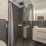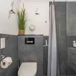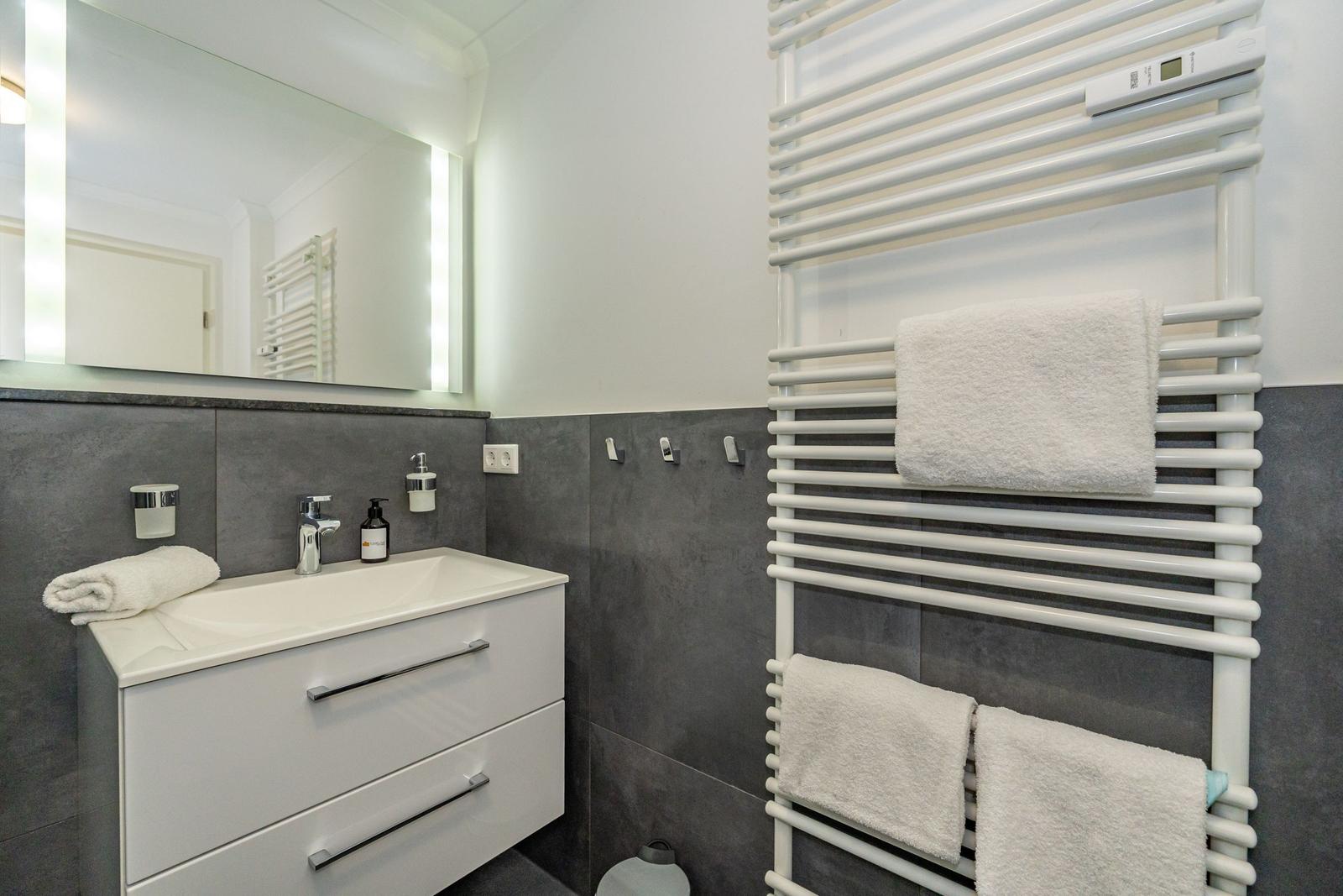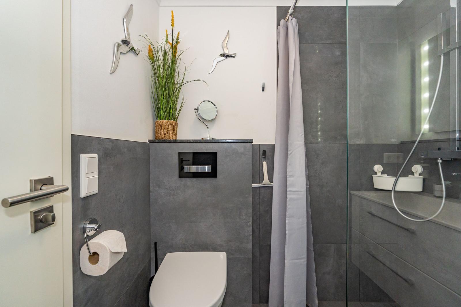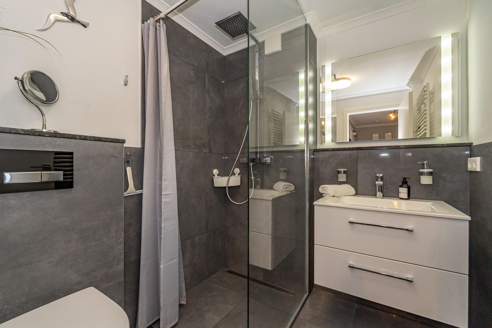 Das Badezimmer ist hell und freundlich eingerichtet und verfügt über eine bequeme, offene Dusche mit Regendusche, Waschbecken, Spiegel, WC und Haartrockner.