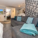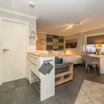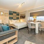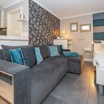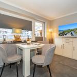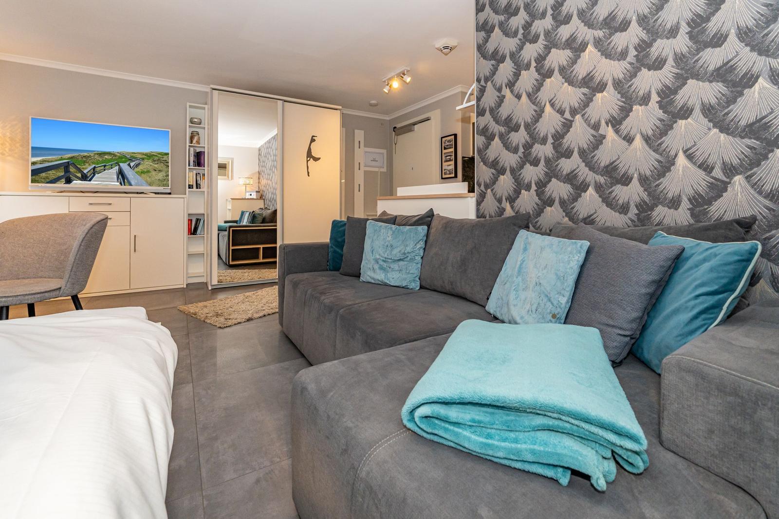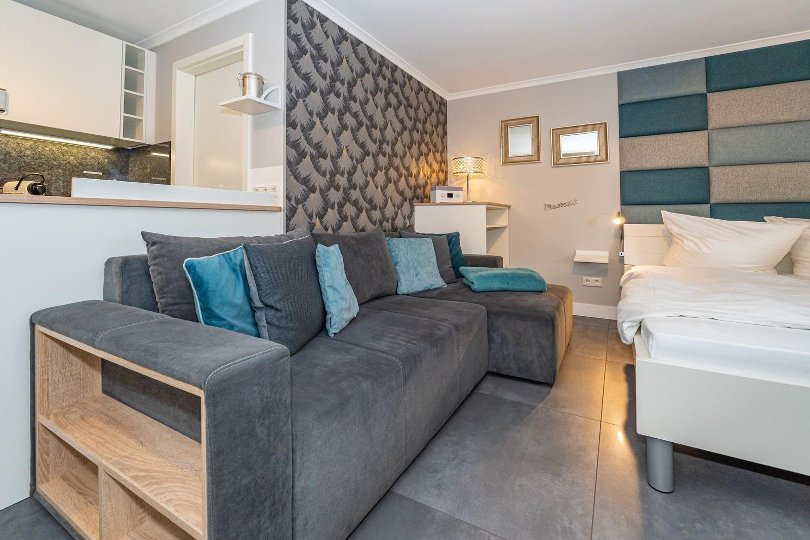 Der modern ausgestattete Wohnbereich besticht durch eine helle, offene Raumgestaltung. Die Kombination aus Sofaecke (ausziehbar zum Bett) und Essbereich schafft eine behagliche Atmosphäre und lädt zu entspannten Stunden ein. Für Ihre Unterhaltung steht Ihnen ein Flachbild-TV zur Verfügung, Internet sowie WLAN sind ebenfalls in der gesamten Unterkunft verfügbar.