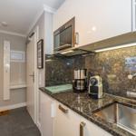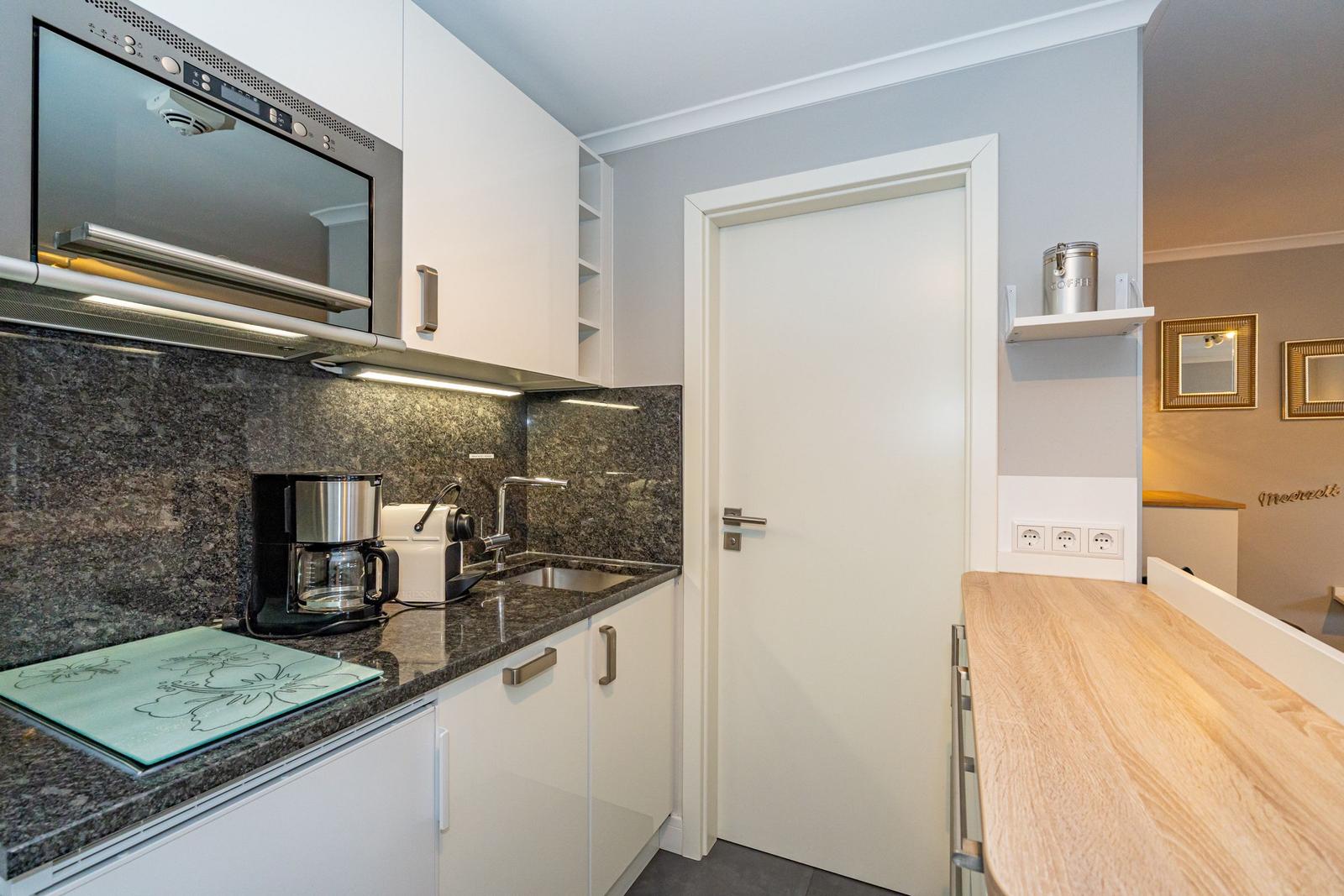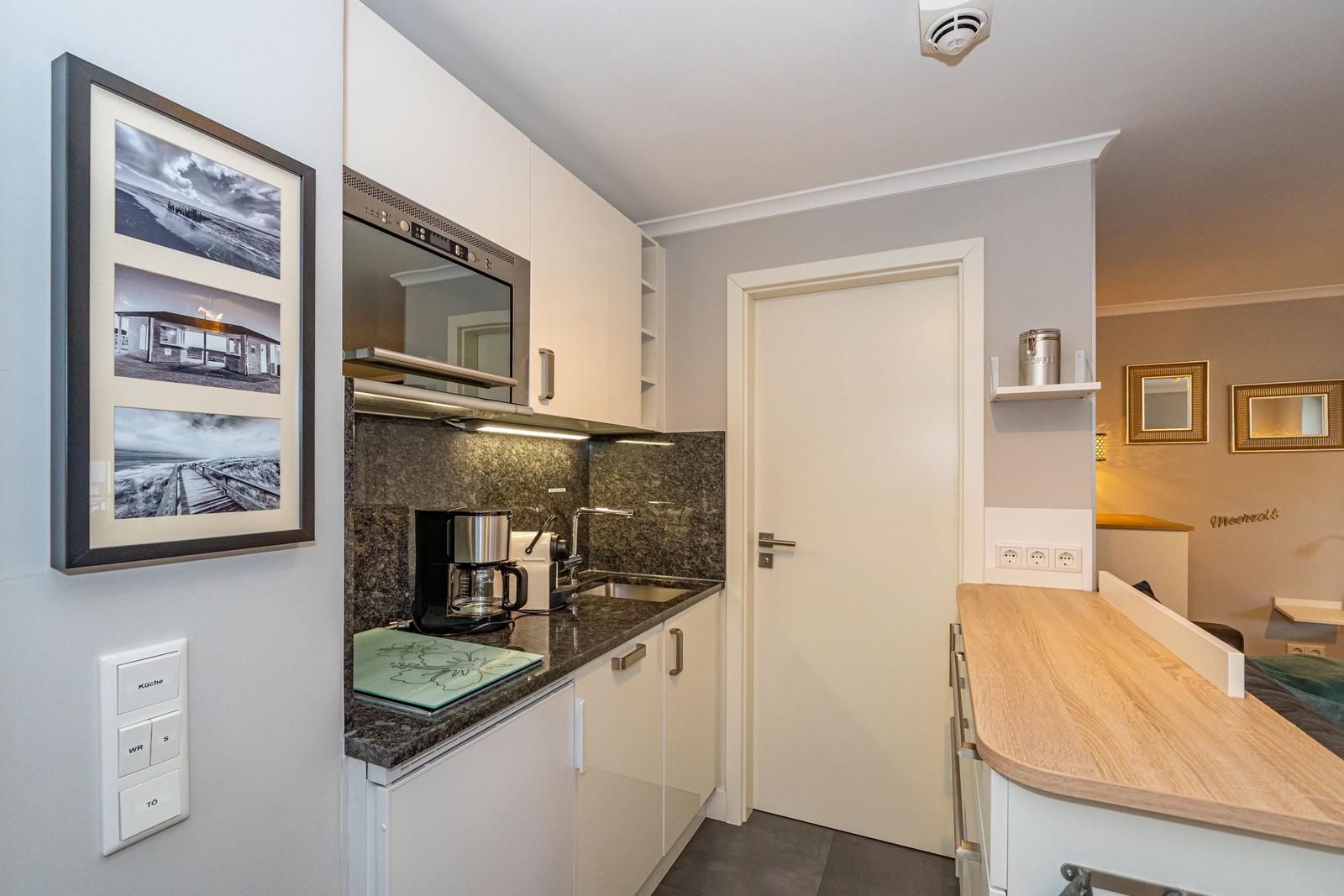 Die offene Küche zum Wohnzimmer ist voll ausgestattet und bietet modernen Komfort: Hier finden Sie einen Kühlschrank, Spülmaschine, Mikrowelle mit Grillfunktion, Herd, Kaffeemaschine, Nespressomaschine, Toaster sowie verschiedenste Küchenutensilien, Geschirr und Besteck. Für die Zubereitung aller Mahlzeiten ist somit bestens gesorgt.